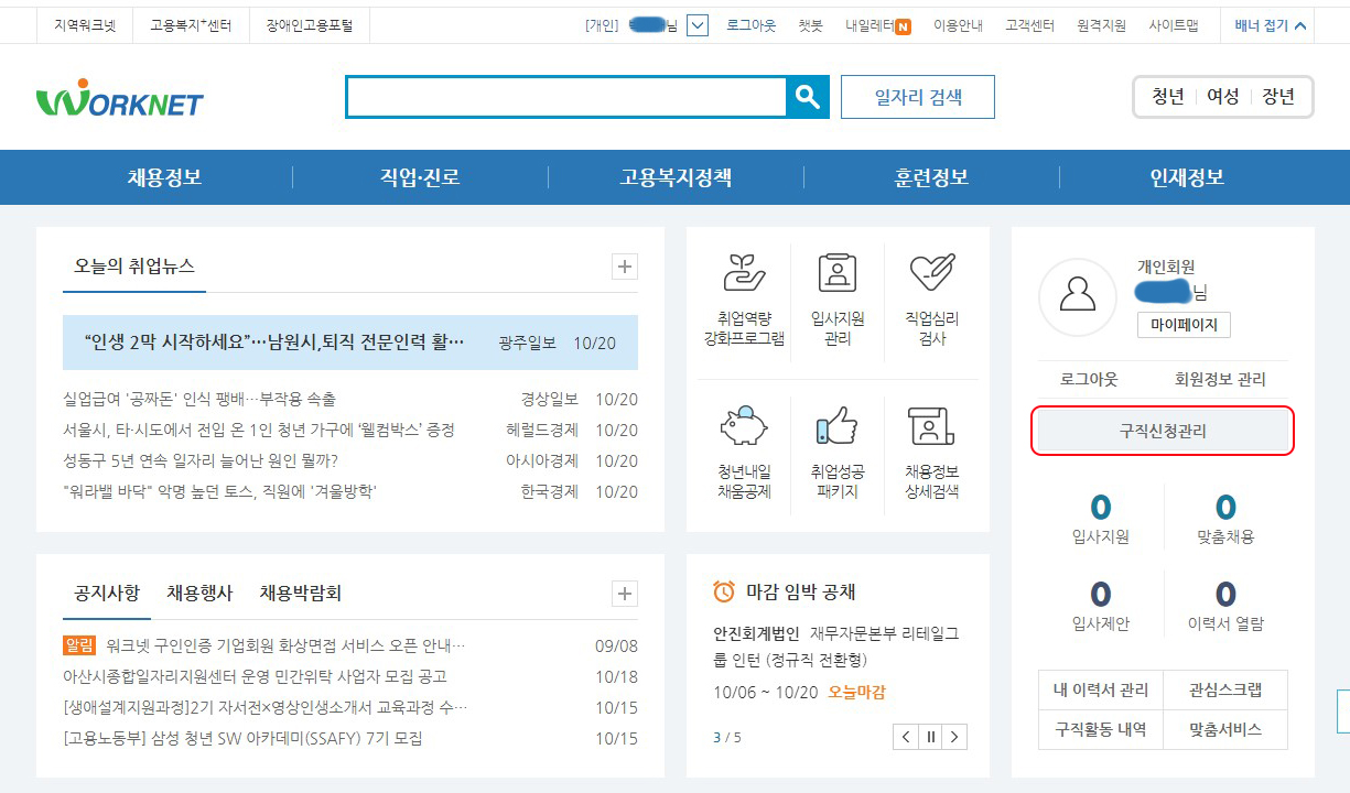 이동해요. 여기서 [구직신청관리]를 클릭!