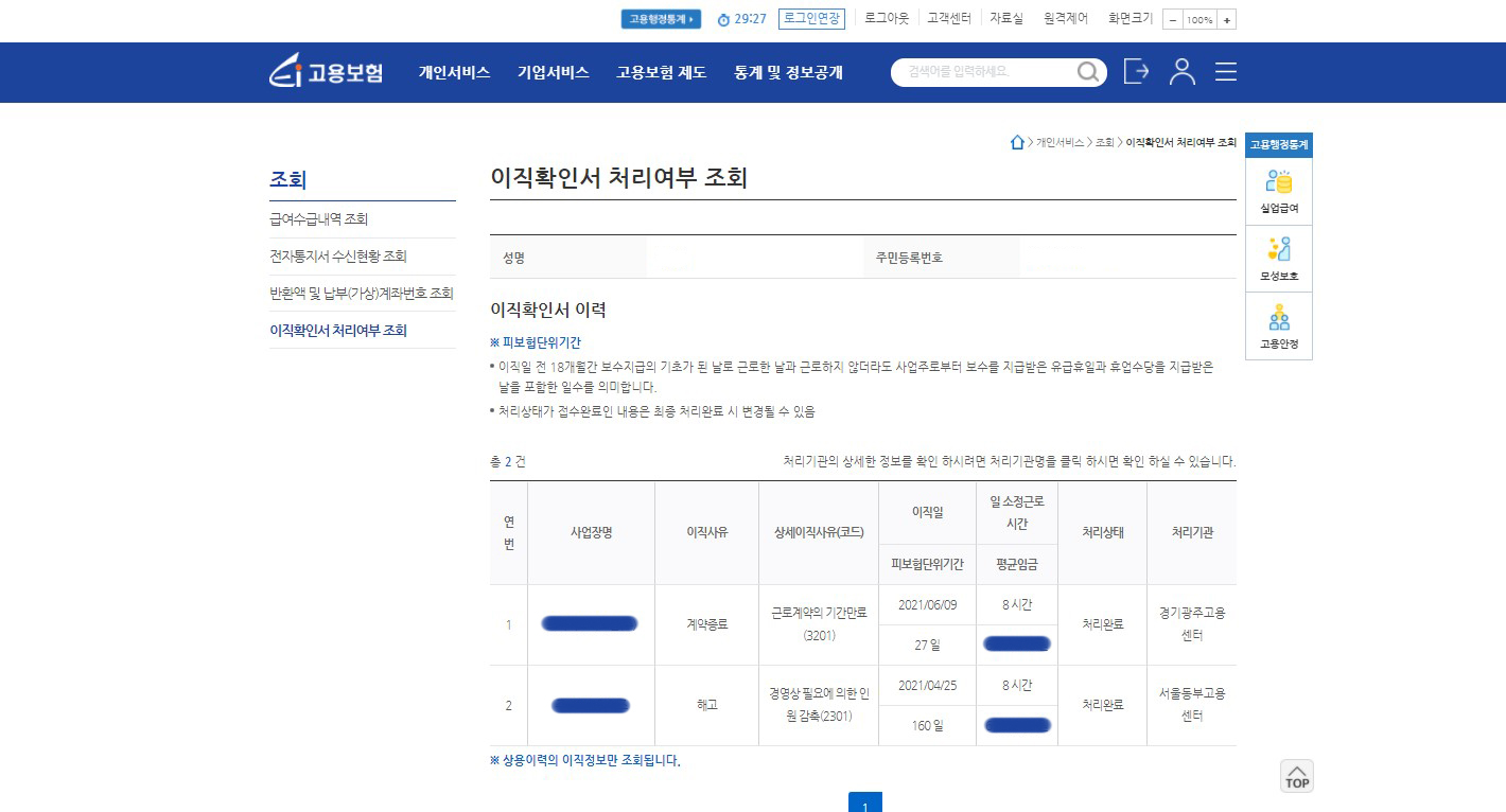그럼 이렇게 [이직확인서] 처리상태를 볼 수 있어요.